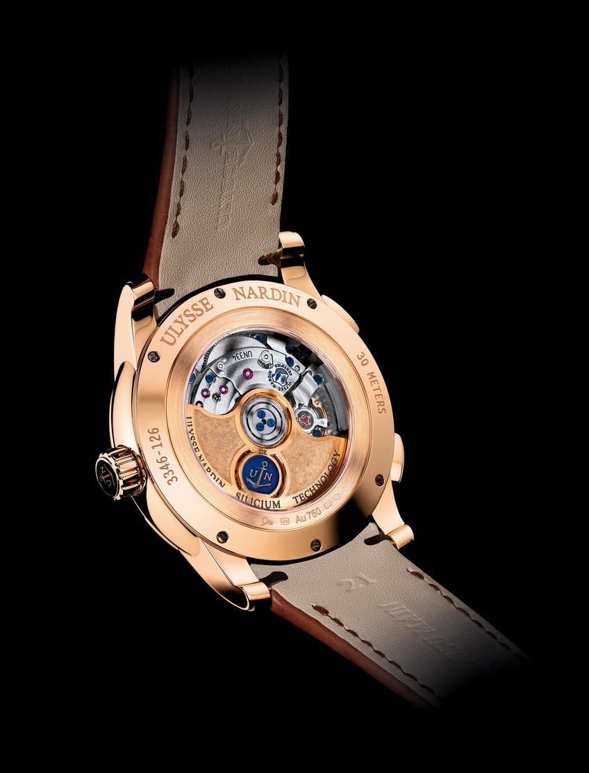 Behind this simplicity of use – a true lesson in functionality – the Manufacture caliber UN-334 deploys the results of many years of research. Featuring a 48-hour power reserve, it is equipped with a silicon anchor, escape wheel and roller. The 4 Hz oscillator also has a patented 1.1.1. silicon balance spring, guaranteeing impressive accuracy. Having made its watchmaking début a little over 10 years ago thanks to the pioneering efforts of Ulysse Nardin, this highly contemporary material requires hardly any lubrication and resists wear more than any other. Complex to work with, its manufacturing techniques remain the prerogative of just a handful of watchmakers. The self-winding movement, a technological gem, is showcased through a sapphire case-back.